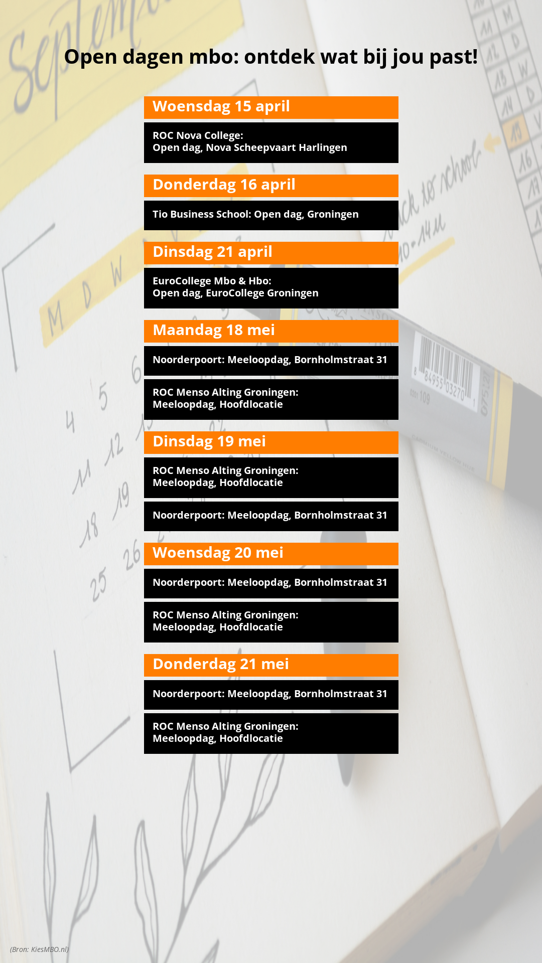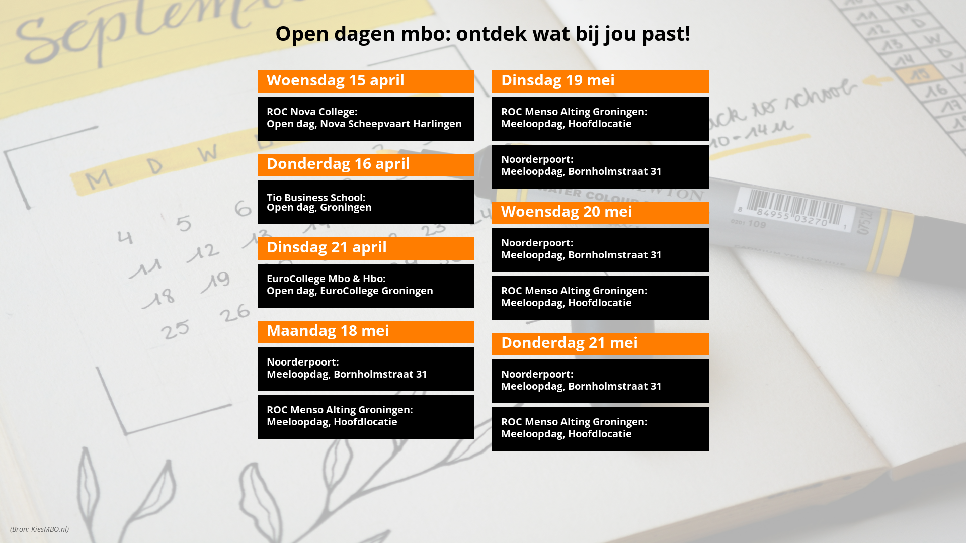 In deze mediakit vindt u actuele overzichten en aankondigingen van open dagen van mbo’s gericht op vo-scholieren.