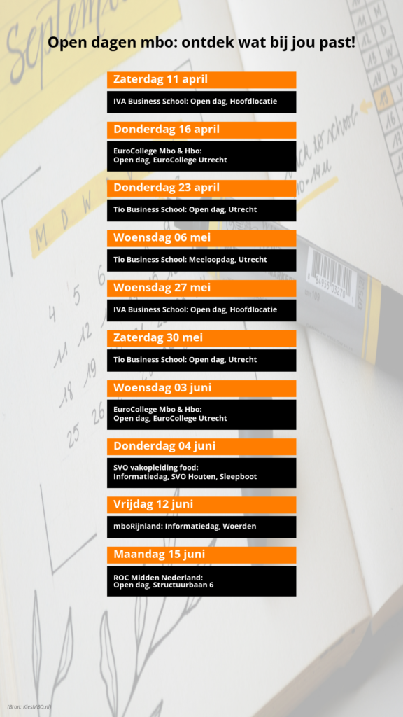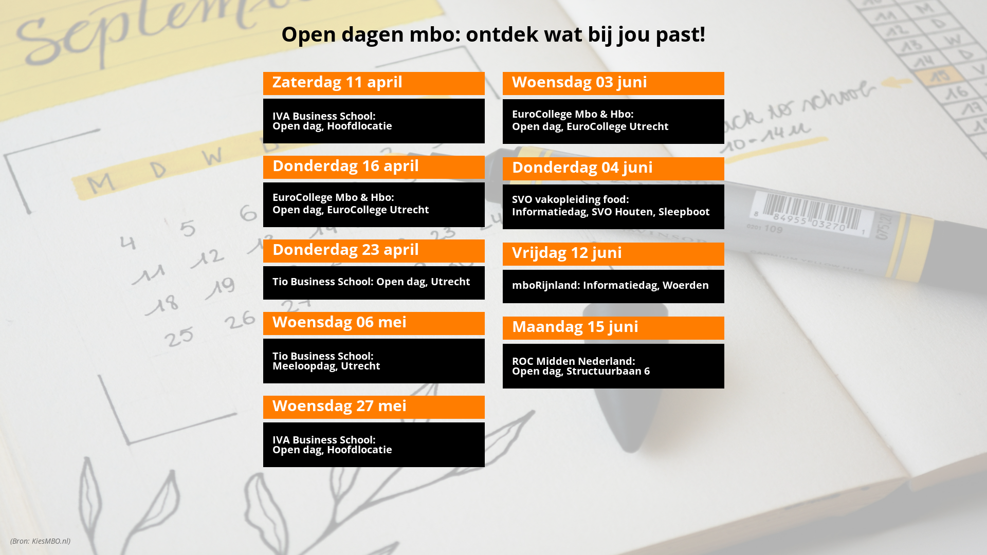 In deze mediakit vindt u actuele overzichten en aankondigingen van open dagen van mbo’s gericht op vmbo/vo-scholieren in de provincie Utrecht.