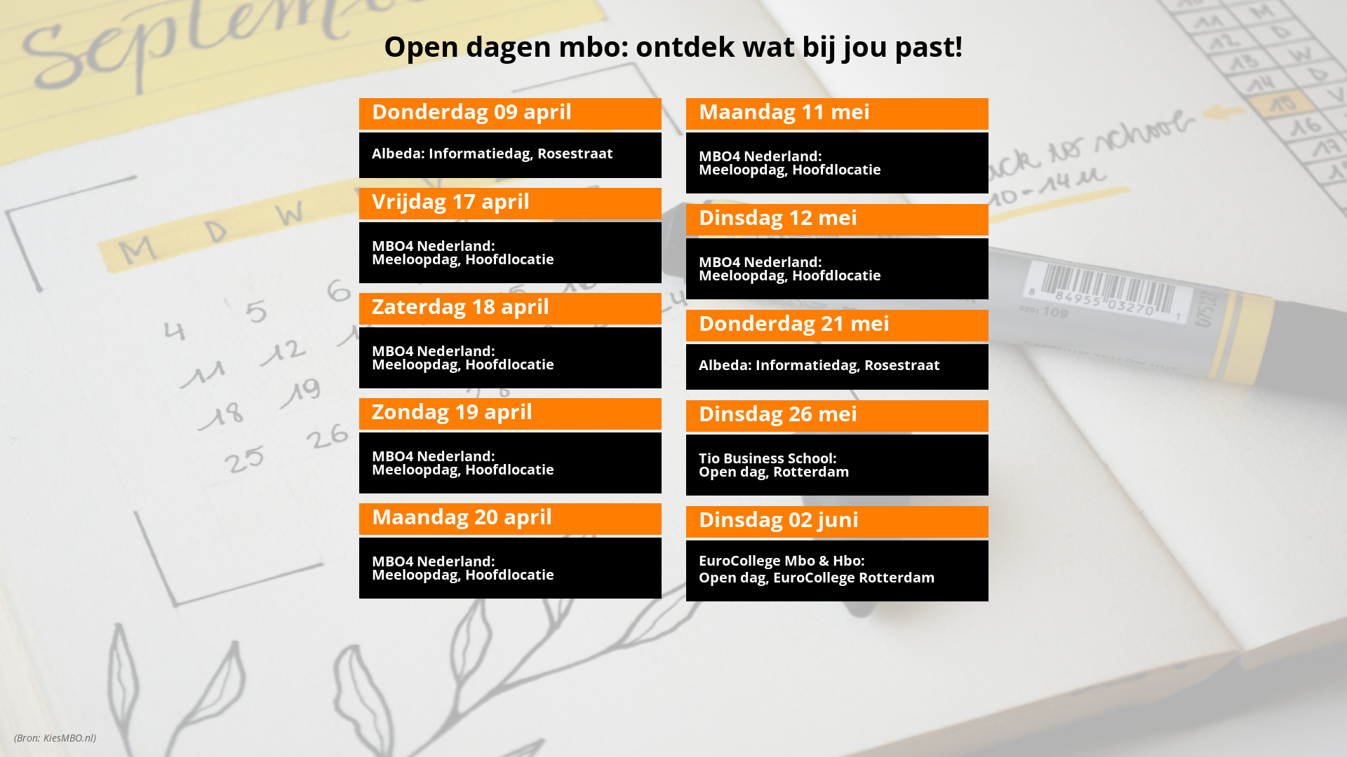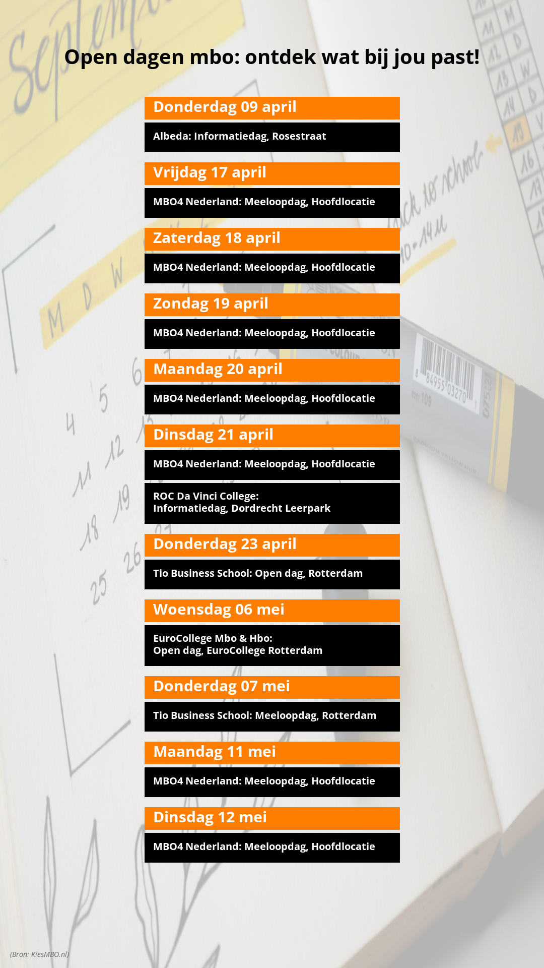In deze mediakit vindt u actuele overzichten en aankondigingen van open dagen van mbo’s gericht op vo-scholieren.